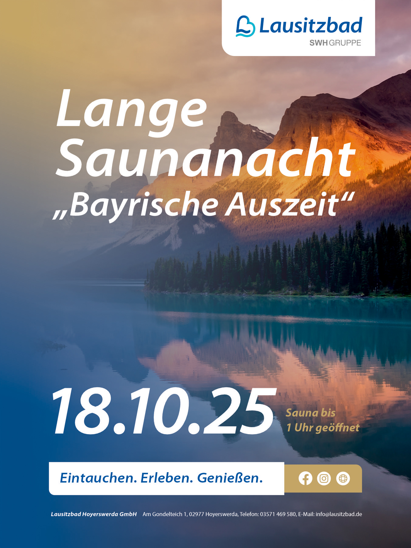 Bei unserer Langen Saunanacht am Samstag, den 18.10.2025 mit dem Motto „Bayrische Auszeit“ erlebst du Saunagenuss mit Hüttenfeeling. Unsere Saunawelt bleibt an diesem Abend bis 1:00 Uhr geöffnet. Freu dich auf wohltuende Aufgüsse mit Alpenflair und kulinarische Schmankerl inspiriert von der bayerischen Küche.